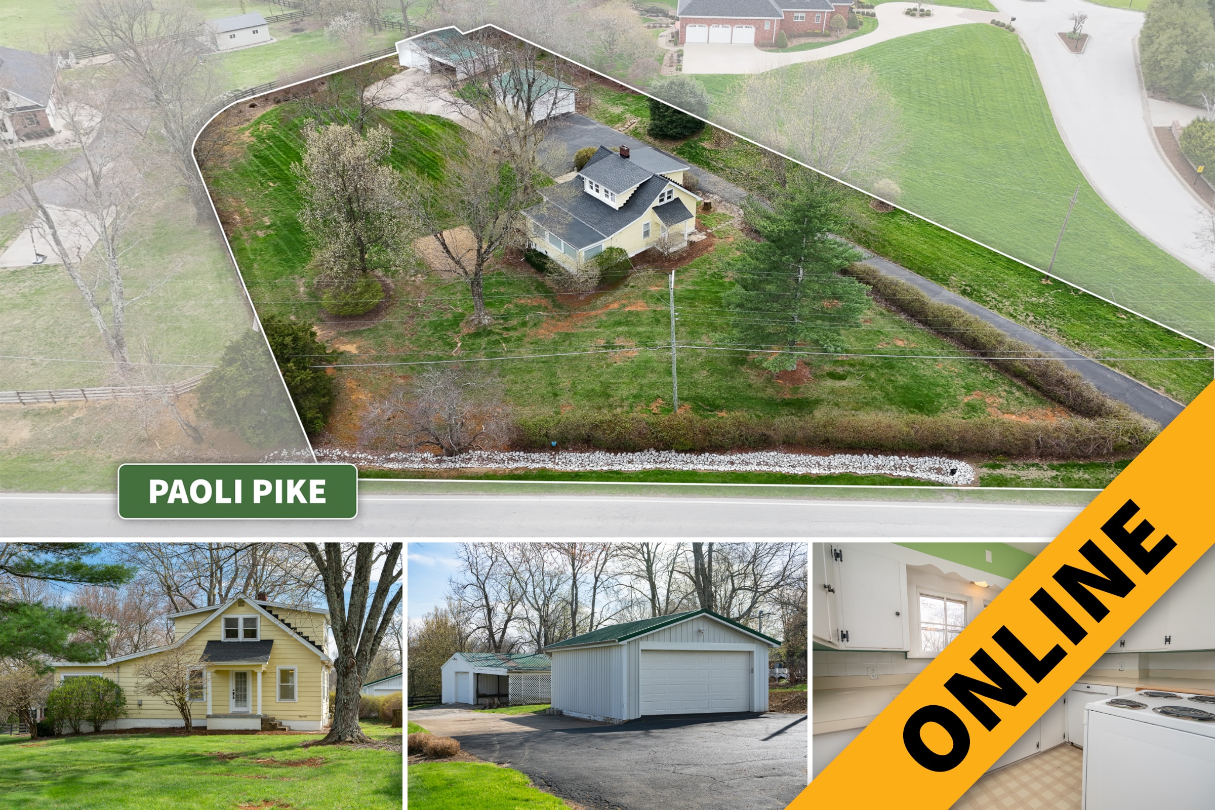 Rare offering at online auction—a charming 1 1/2 story clapboard sided cottage on 0.99 acres including a garage and pole barn, tucked along scenic Paoli Pike in the heart of Floyds Knobs. Easy access to expressways—just minutes from Louisville.