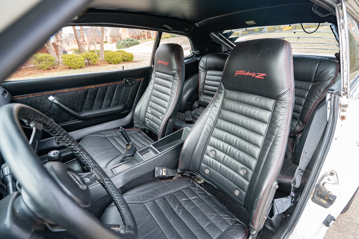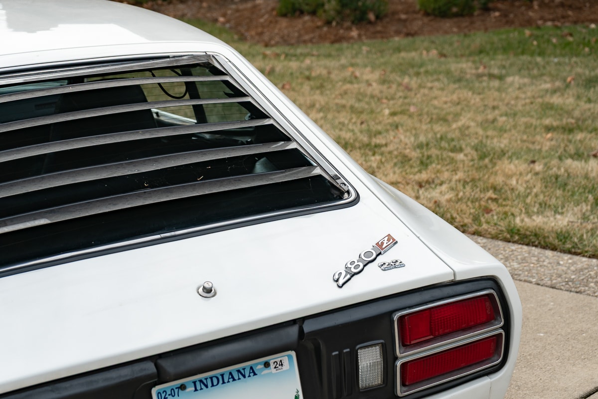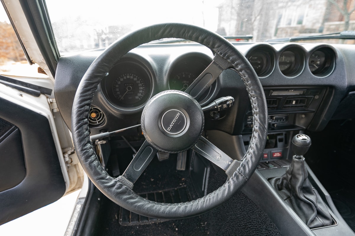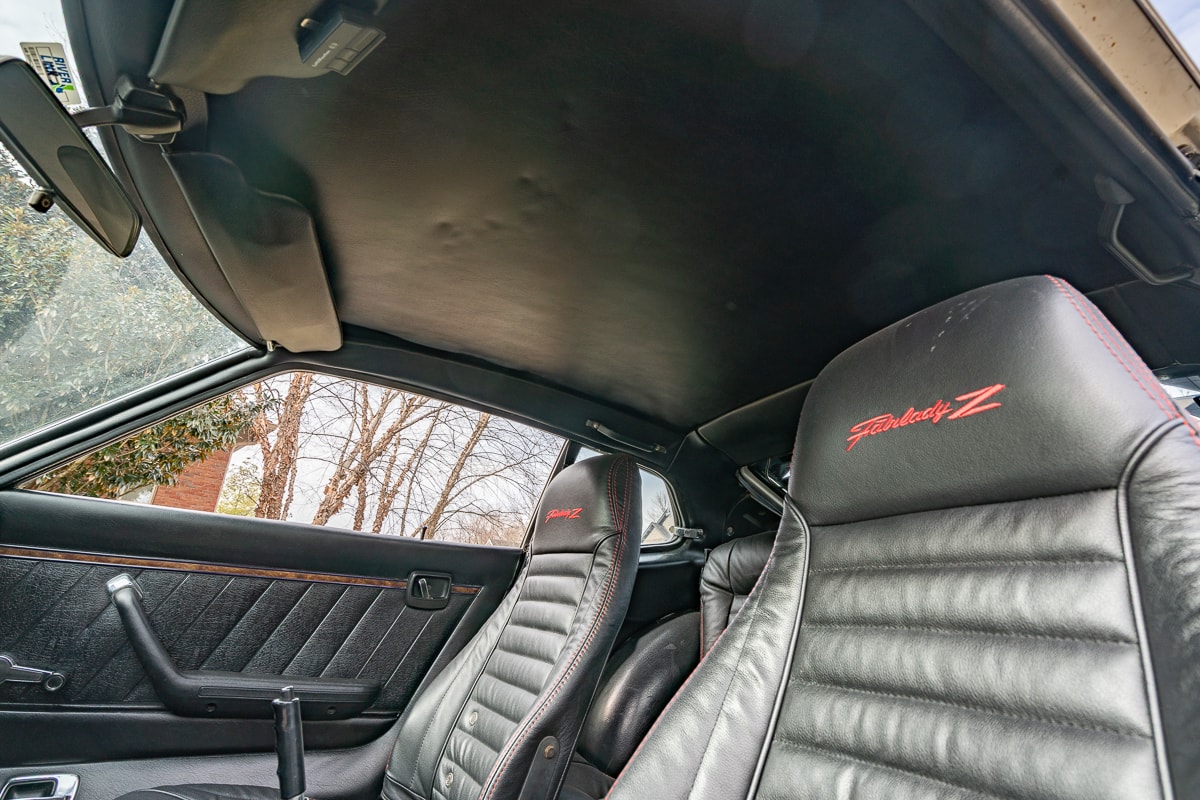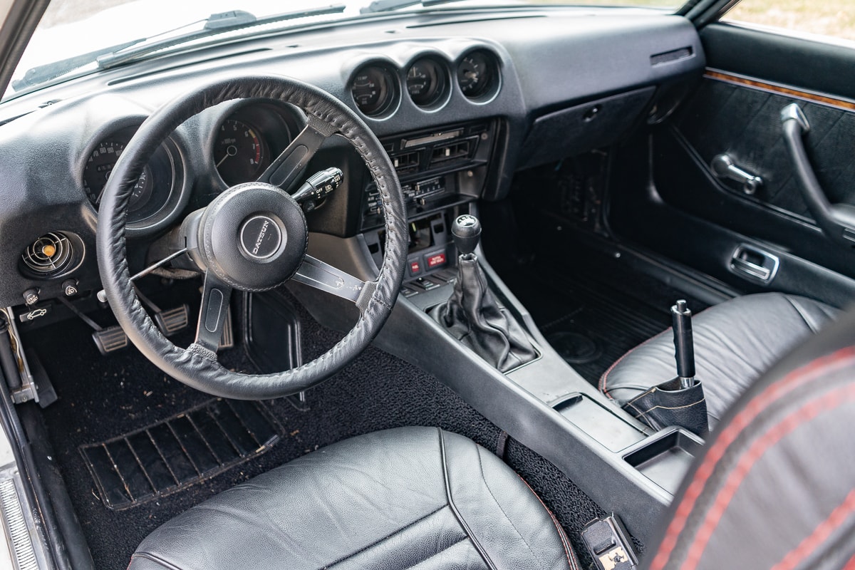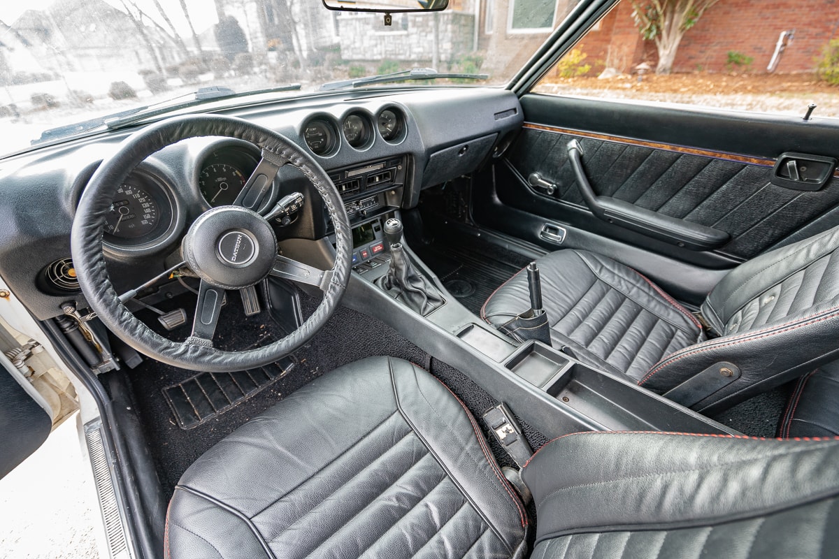 Inside, the 280Z features new carpet, a new shift knob, a leather-wrapped steering wheel, new leather seat covers, and refurbished interior panels (rear panels show some age-related cracking). A new dash cap maintains a period-correct appearance. Most weatherstrip seals have been replaced, and the original spare tire remains with the car.