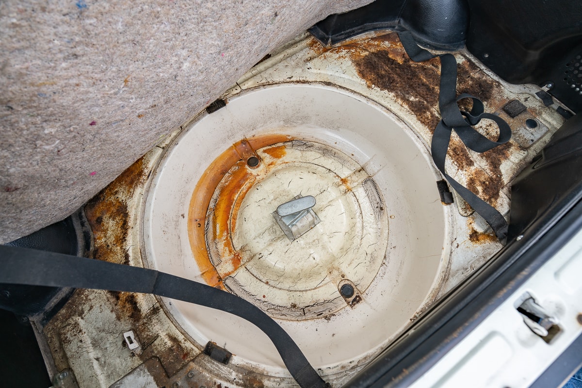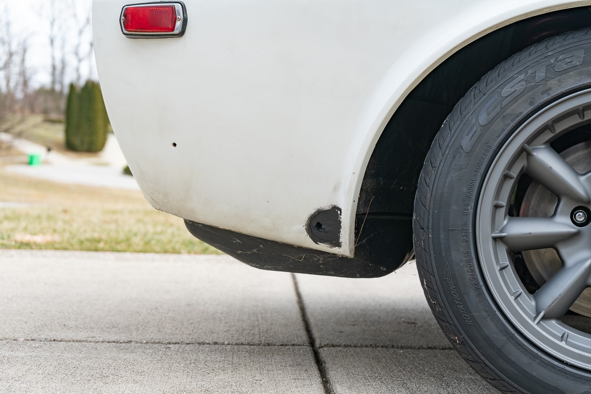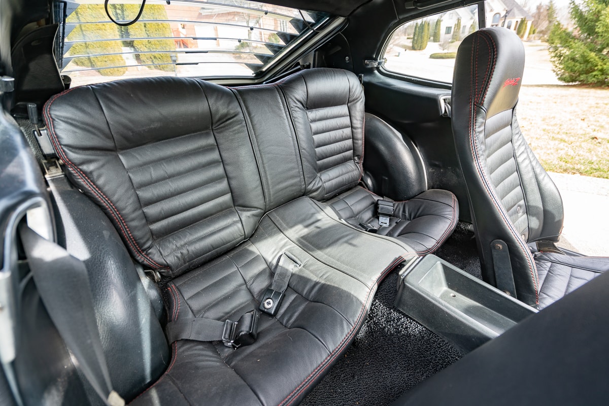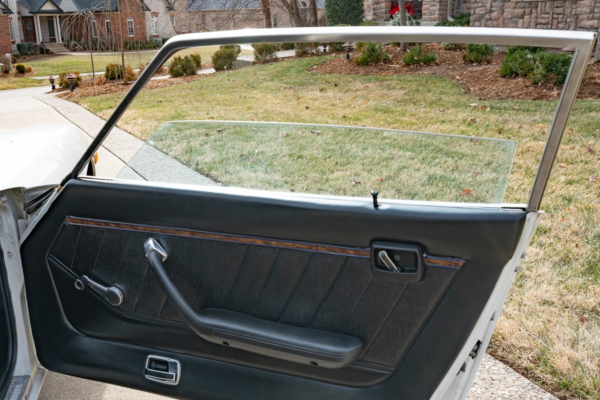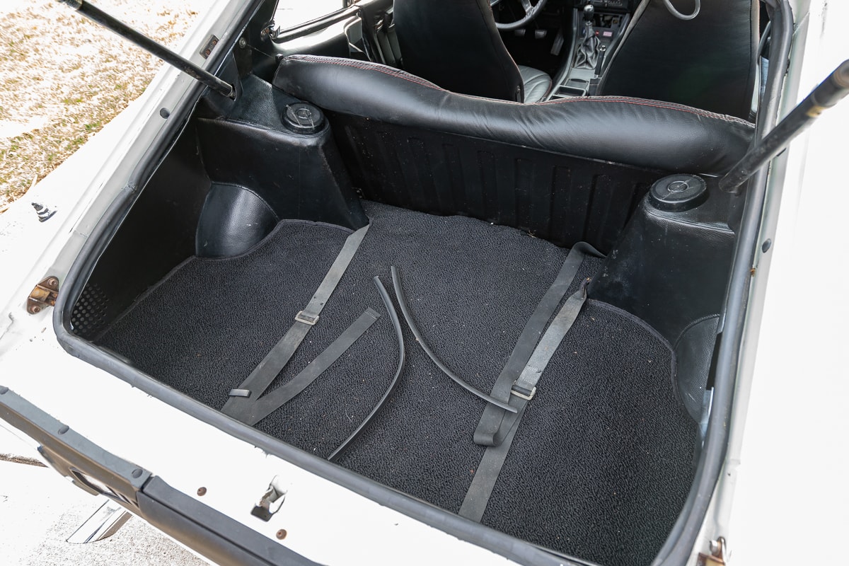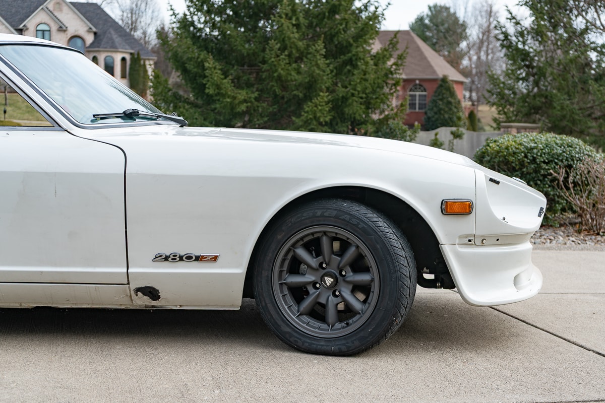 Inside, the 280Z features new carpet, a new shift knob, a leather-wrapped steering wheel, new leather seat covers, and refurbished interior panels (rear panels show some age-related cracking). A new dash cap maintains a period-correct appearance. Most weatherstrip seals have been replaced, and the original spare tire remains with the car.