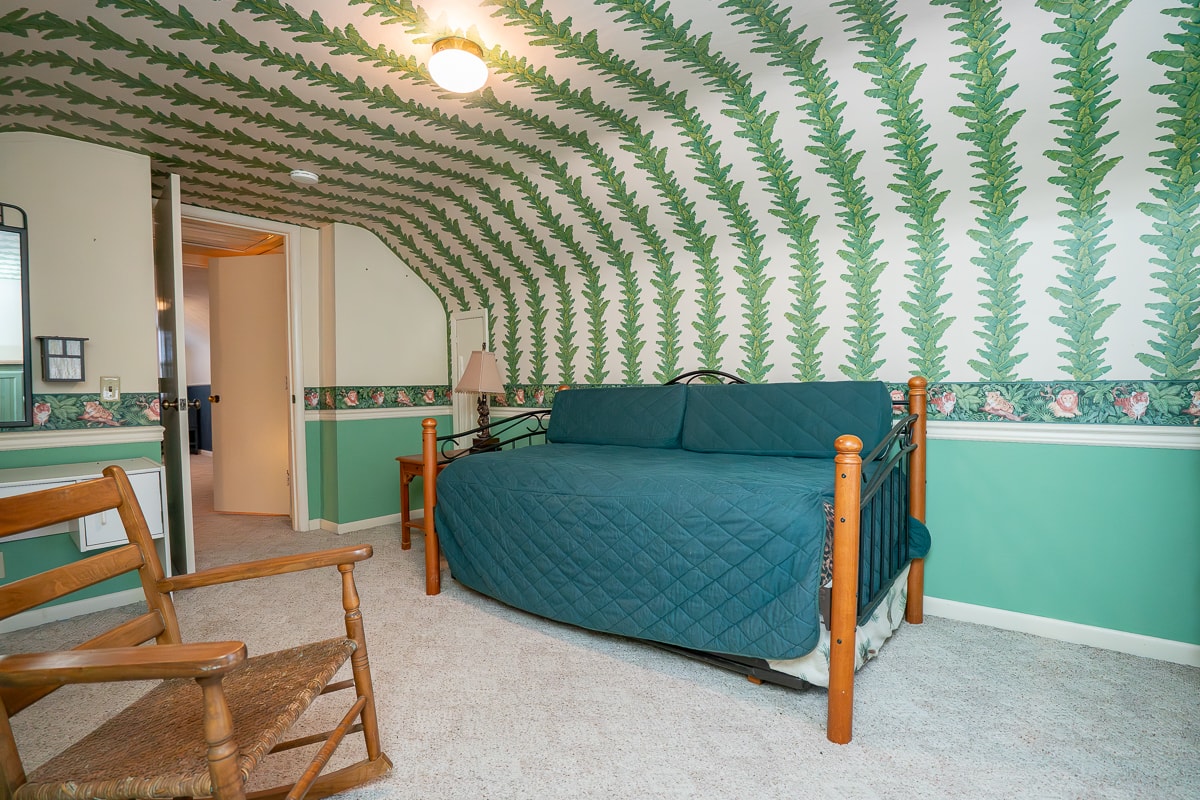 The main level features a spacious family room with wood beamed cathedral ceiling, gas fireplace and wet bar surrounded by abundant casement windows bringing the outdoors in. There are two bedrooms – one with a floor to ceiling built-in wall unit, a nearby full bath, equipped laundry closet, and a living dining room with wet bar, and two sliding doors to a wrap-around deck that overlooks the garden and pond. The upper floor features two bedrooms with angled 7’ ceilings and a half bath.