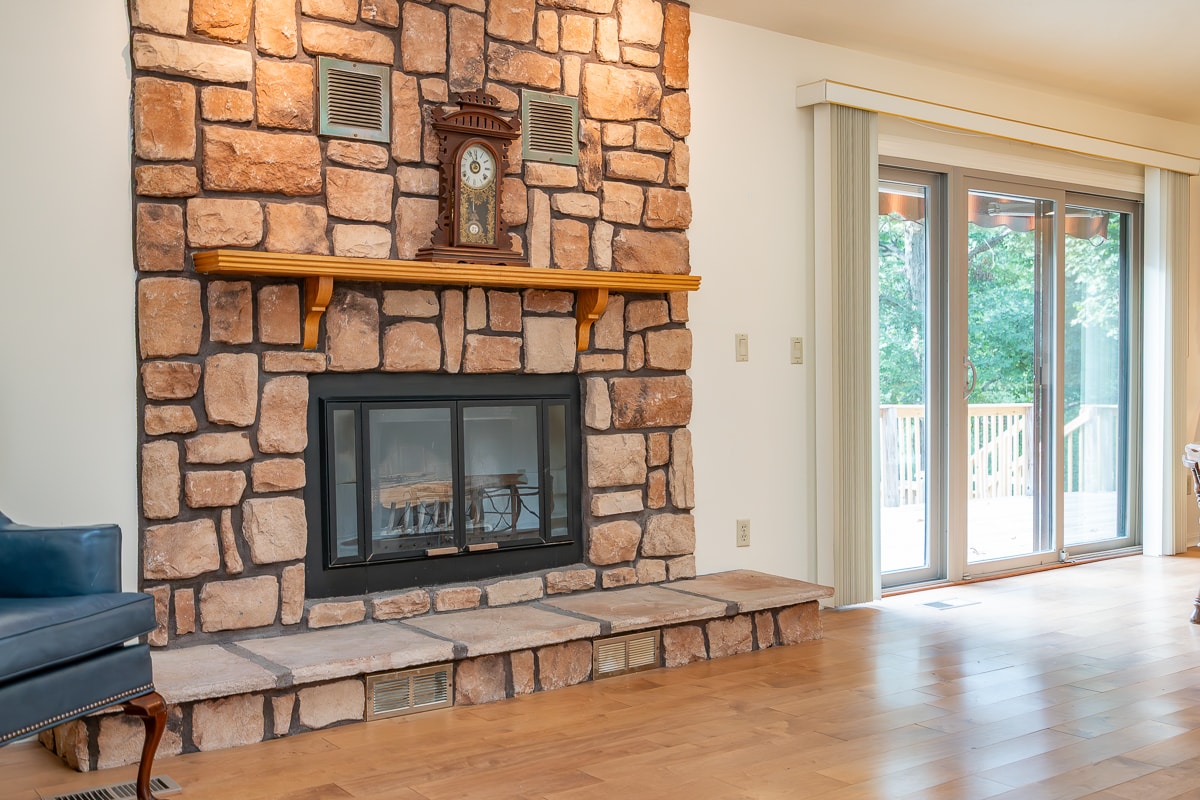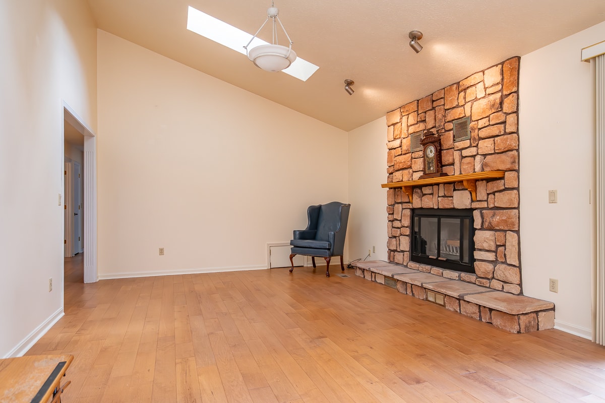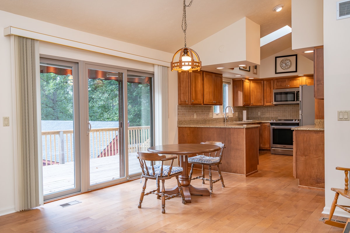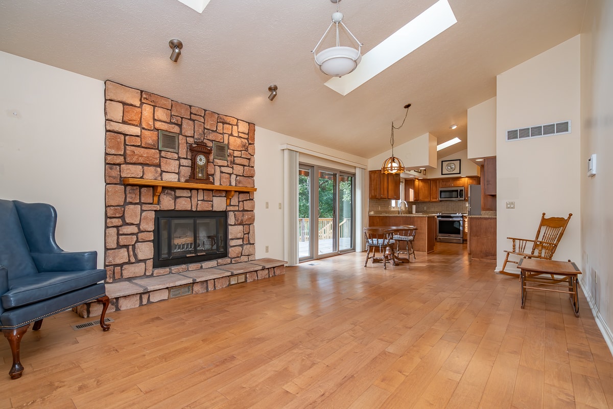 - Hearth Room with 11’ Vaulted Ceiling, Woodburning Fireplace, Skylights & Deck Access