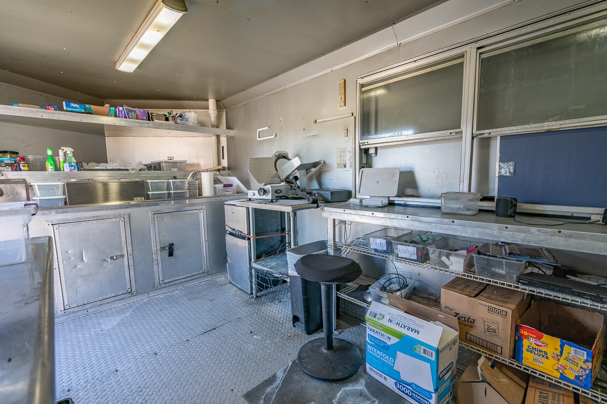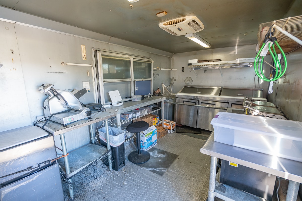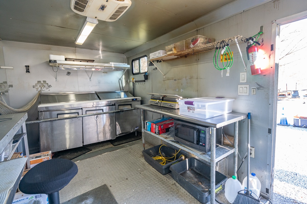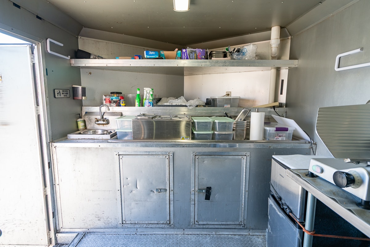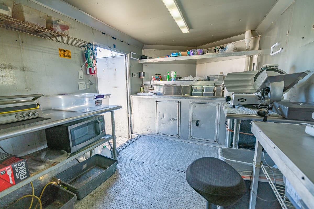 FEATURES: Retractable Awning, Fold Up Serving Window & Counter, Roof Air Conditioning, Honda EV Generator, Refrigerator, Microwave, Prep Table & Sink, Stainless Steel Tables, Panini Presses, KWS Meat Slicer & Kitchen Supplies.