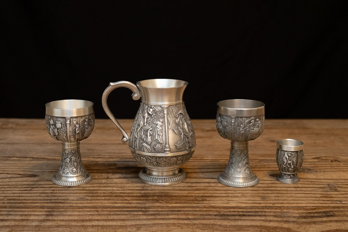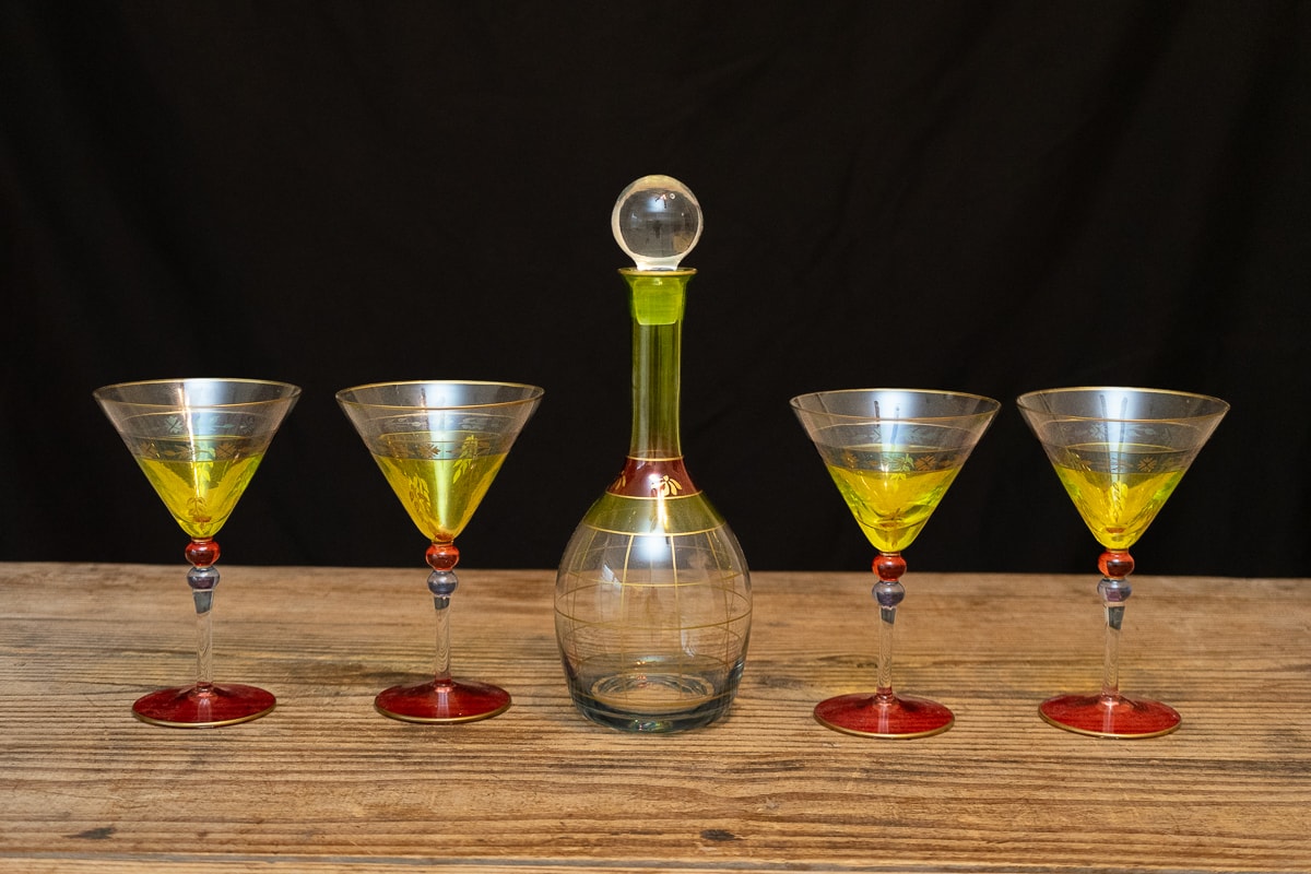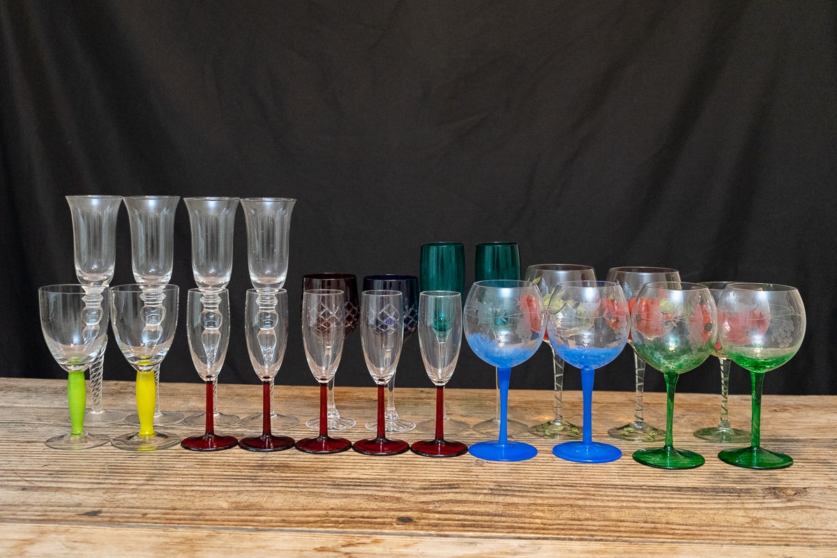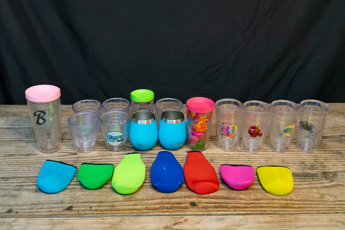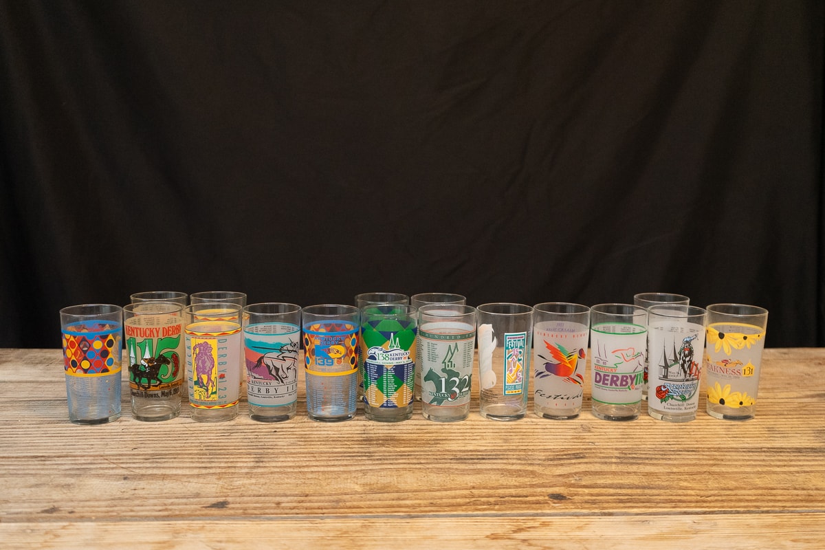 Amber Wine Goblets and Water Glasses, Etched Glass Decanter and Glass Set, Collection of Kentucky Derby Julep Glasses, Etched Italian Wine Stemware Glasses, Waterford Clarendon Emerald Green Champagne Flutes, German Pewter Wine Goblet Set, Two Crystal Decanters, Collection of Colorful Stemware, Marquis Waterford Brookside Wine Stoppers, Collection of Barware, Yeti Wine Glasses, Tervis Tumblers and Koozies, Frontgate Ice Bucket and Collection of Drinking Glasses.