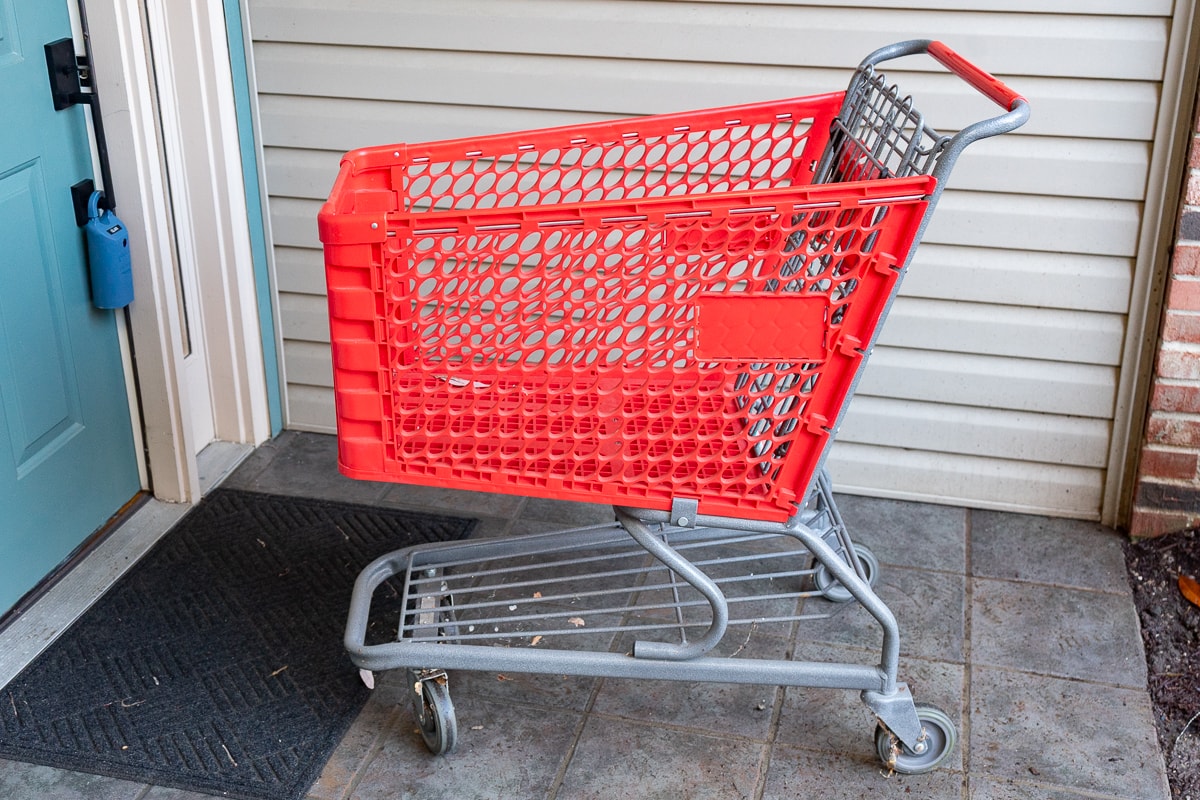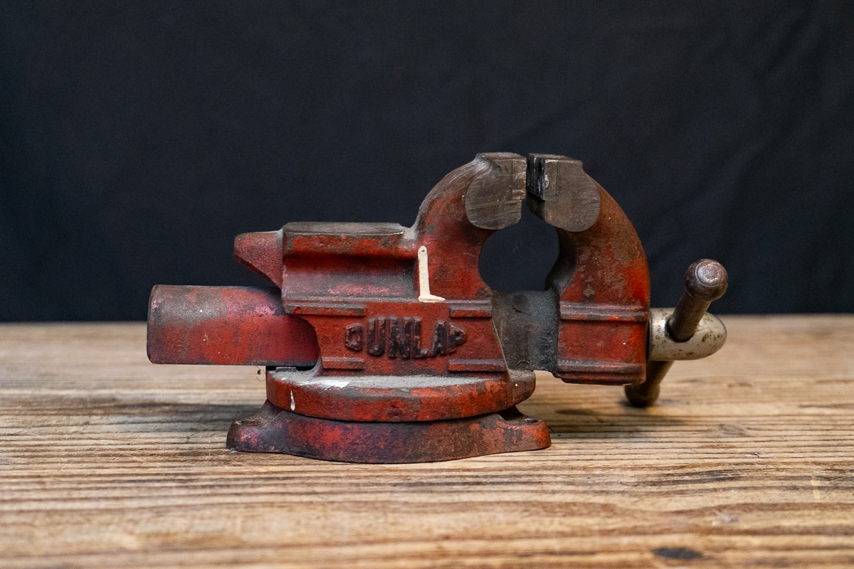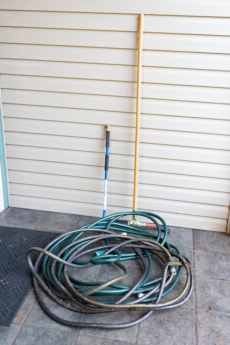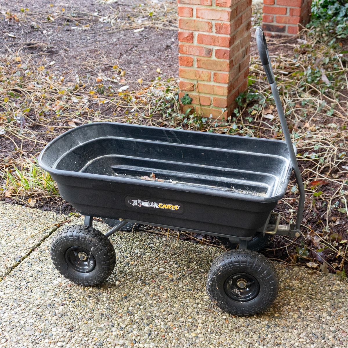 Gorilla Poly Dump Cart, Water Hoses and Squeegee, Red Shopping Cart, Dunlap 5244 Table Vise, Collection of Tools and Hardware.