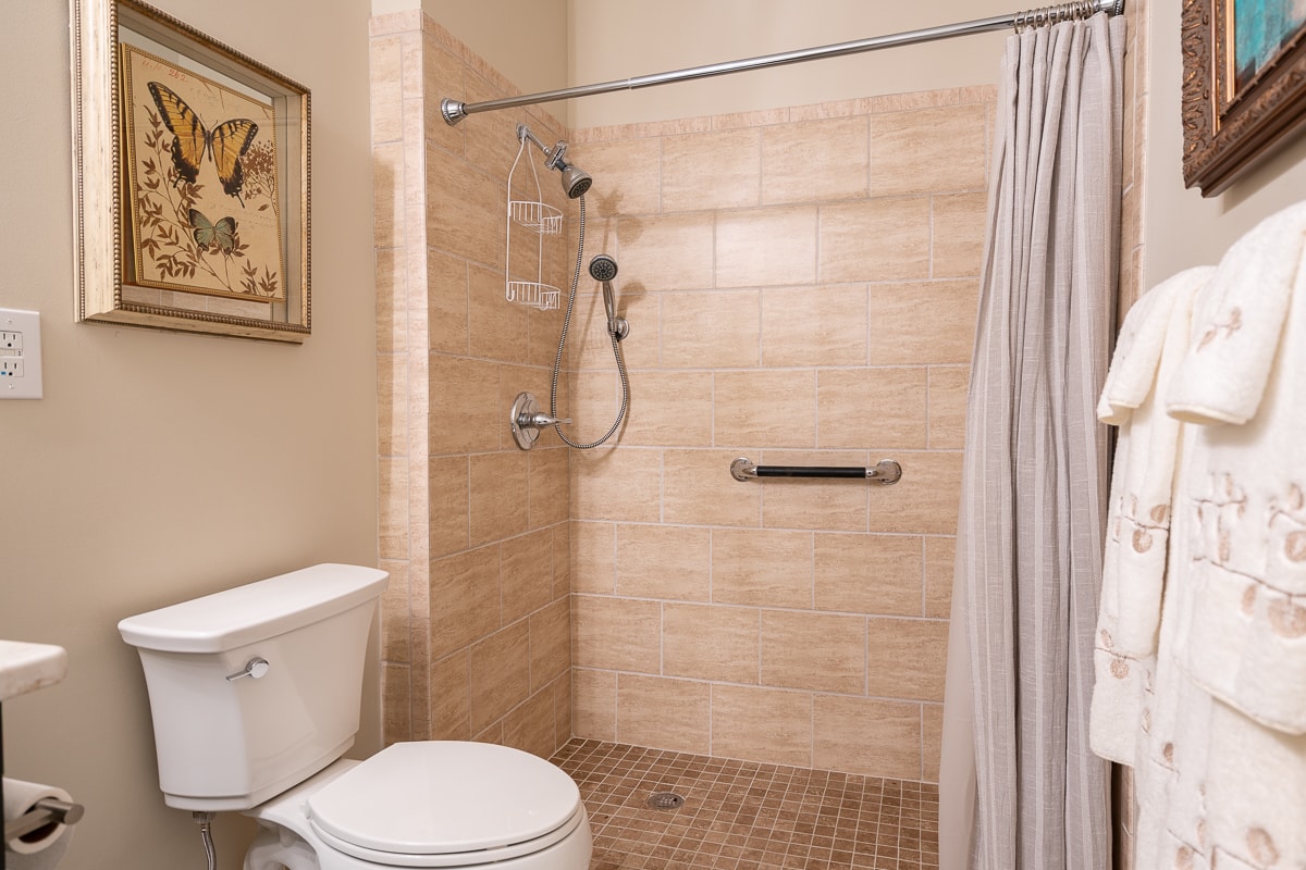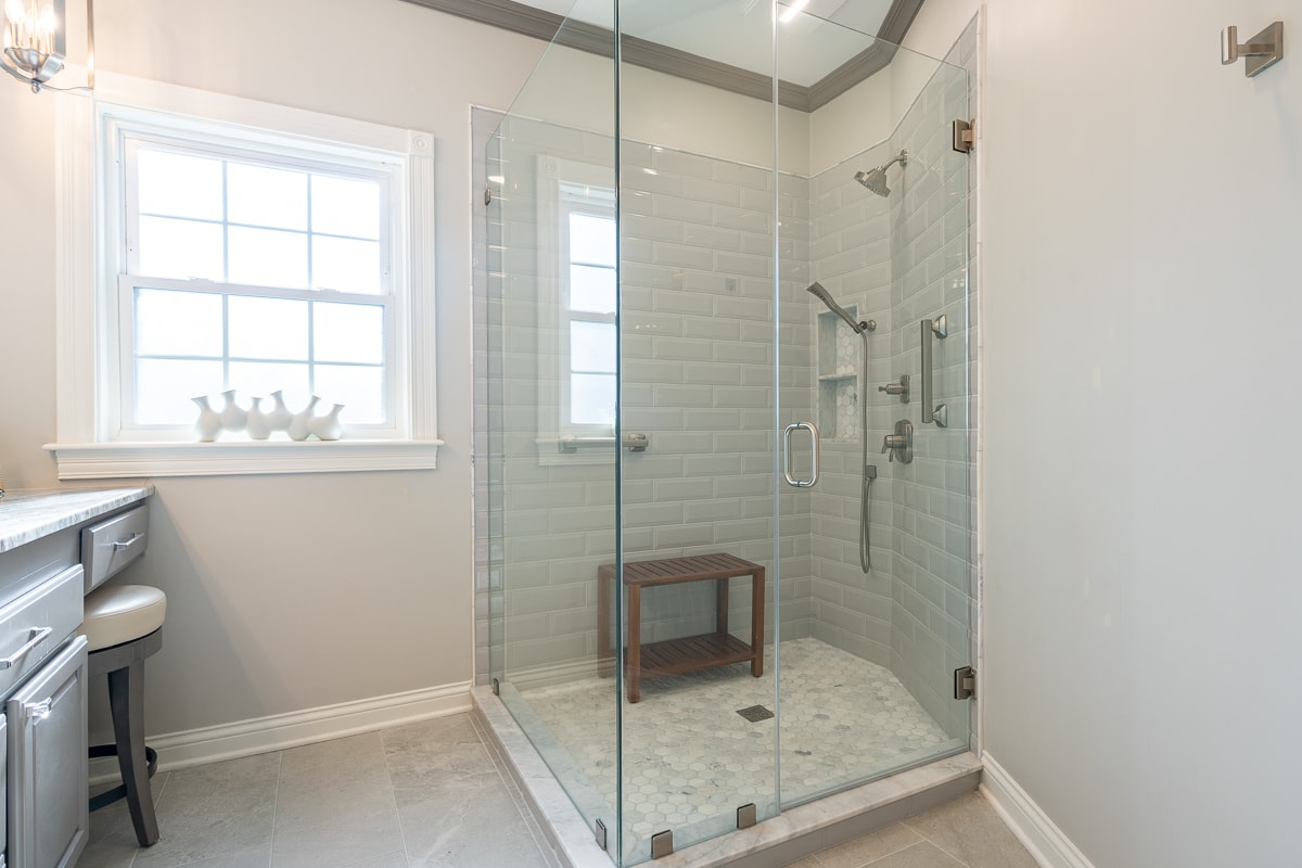 • No-step, curbless tile shower