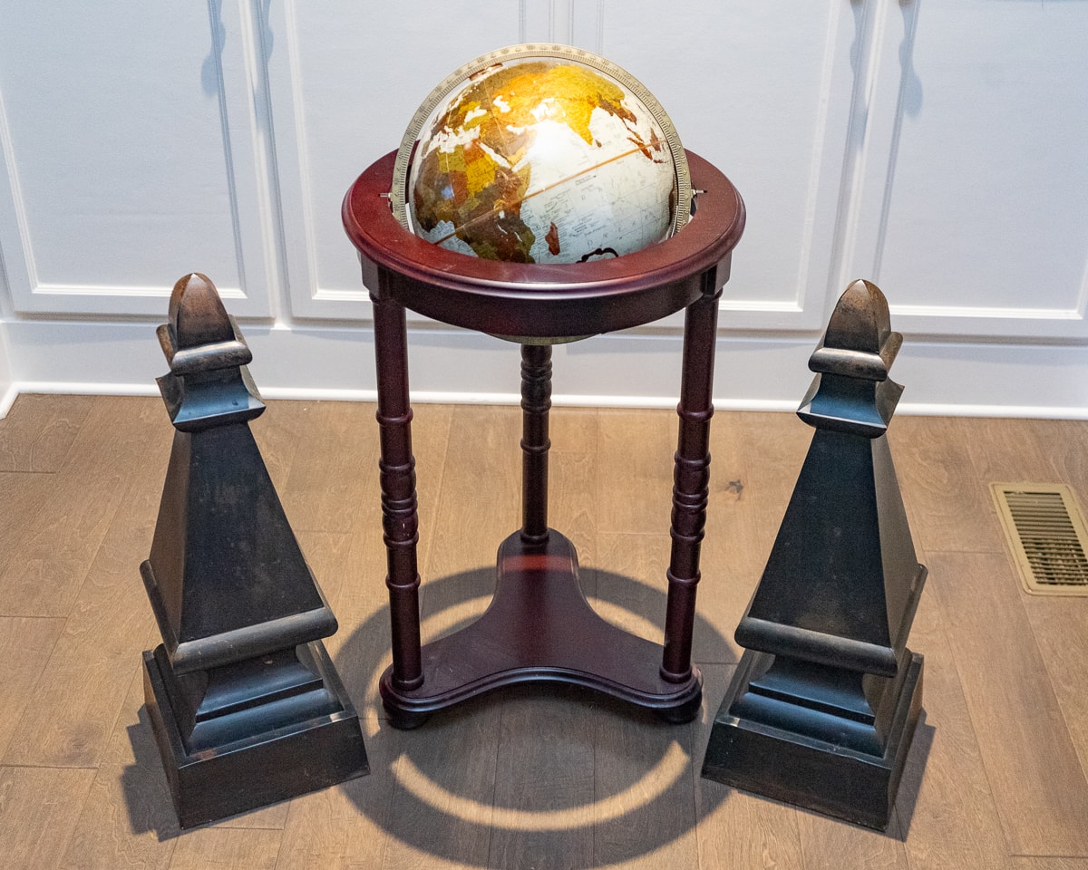 Large Roman Numeral Wall Clock, Torchiere Floor Lamp, Large Black Framed Mirror, Inlay Round Mirror, Large Resin Peacock, Collection of Modern Home Decor, Decorative Barn Wood Horse Sculpture and Armillary Sphere, Two Bird Table Lamps, Modern Primitive Home Decor, Pair of Turned Table Lamps, Modern Rustic Mirror and Reef, Modern Globe and Pair of Accent Pillars, Modern Metal Floral Decor, Halloween and Fall Decor, Large Collection of Christmas Decor, Large Three-Arm Floor Lamp, Pair of Artificial Ficus Trees, Upholstered Foot Rests, Vases & Decor, Massive Wall Map, Five Table Lamps, Faux Bamboo Shoots and Twisted Stick Decor, Console Table, Mirror, Basket and Textured Wall Hangings, Ornate Floor Lamp, Vintage Desktop Decor and Collectibles.