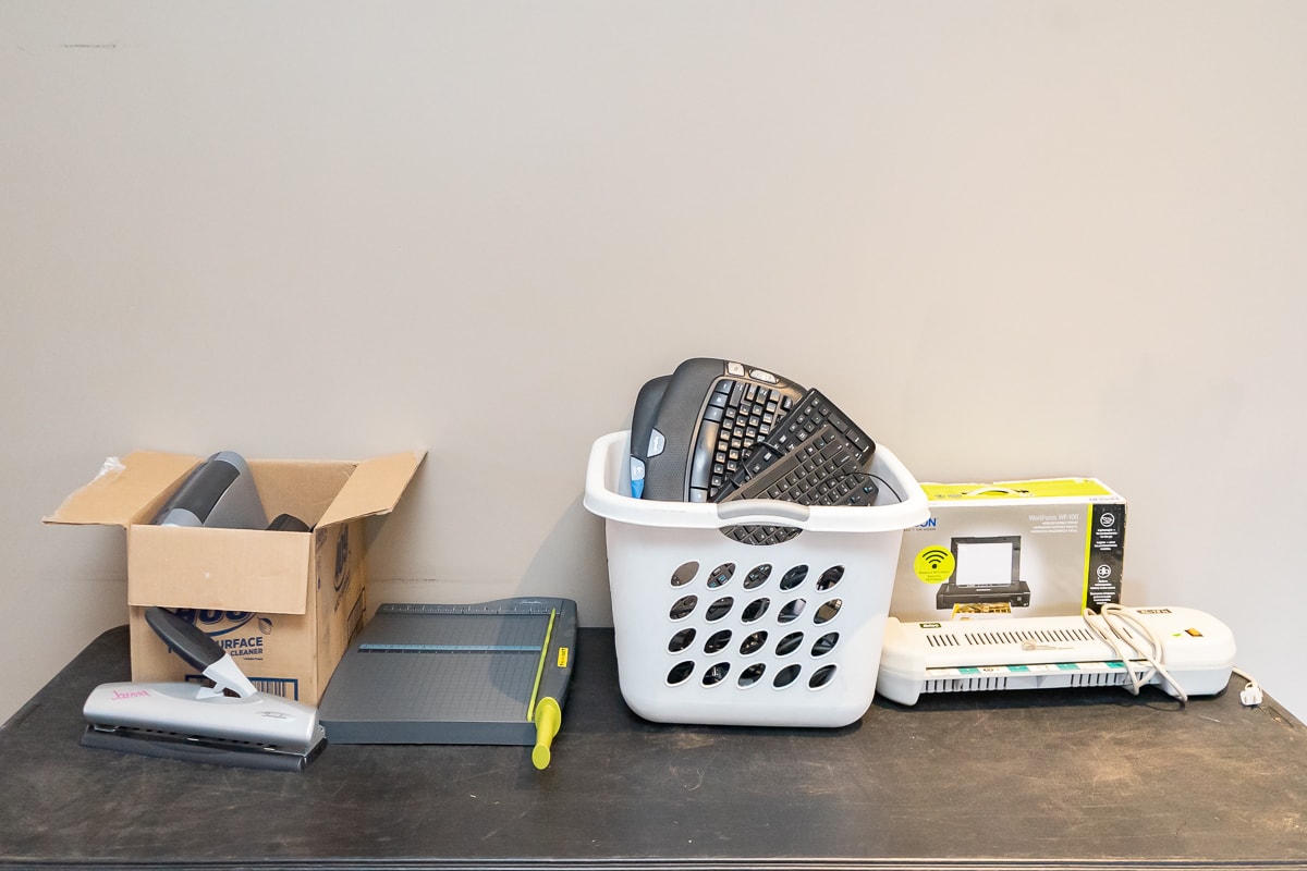 StarCraft 15″ x 15″ Clamshell Heat Press, X-Acto School Pro Pencil Sharpener, Cricut Explore Air Cutting Machine, Scotch Model TL 1306 Laminator, Generic Clothing for Arts & Crafts plus Contents of Craft Room, Large Craft Room Table and more.