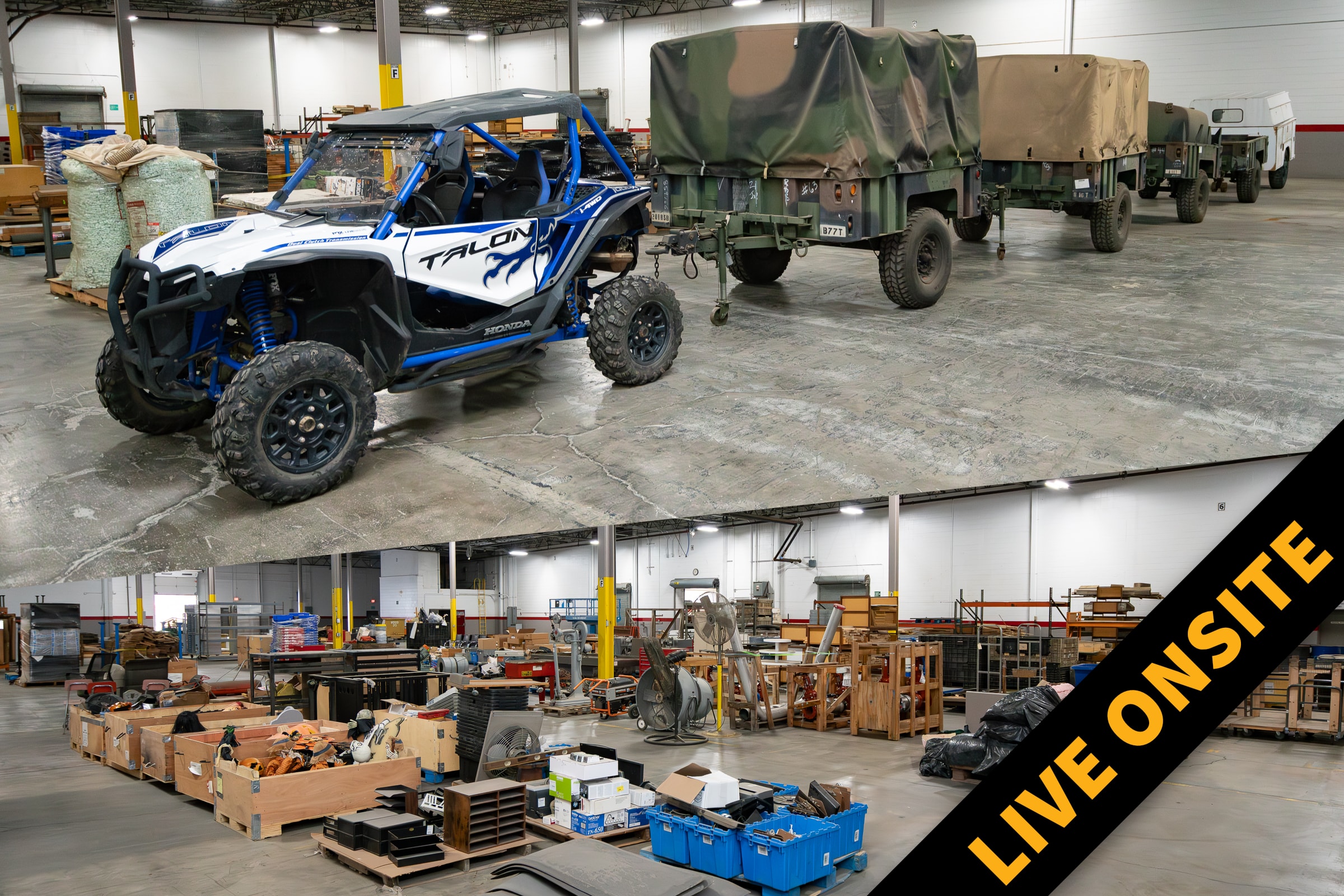 Get ready – this is a massive, one-time-only warehouse liquidation for the Rick Koetter Family, featuring the contents of their 25,000 sq. ft. downtown Borden facility! If you love big auctions packed with surprises, this is THE event you don’t want to miss. We’re selling it ALL, live and onsite – A Ford F-450 Utility Bed Truck (as-is), Military M1102 Cargo Camo Trailers, 2021 Honda Talon 1000 4WD Side x Side, Edgewater center console boat (as-is), commercial & industrial equipment, 45,000 lbs. of Tennessee Limestone, building materials & assorted lumber, generators, water pumps, compressors & tools, commercial kitchen equipment including a NEW Grindmaster 7416 6-Gallon Coffee Urn, office equipment, warehouse carts & Span-Track conveyor, heavy-duty electric motors, industrial valves (Kennedy & Zurn), scrap metal, tanker trailer & barrels, furniture, bicycles, toys, household goods & SO much more!