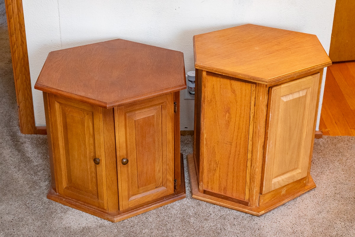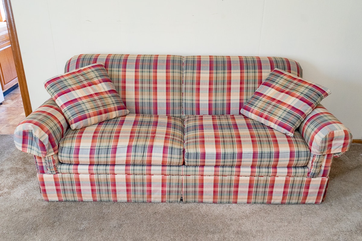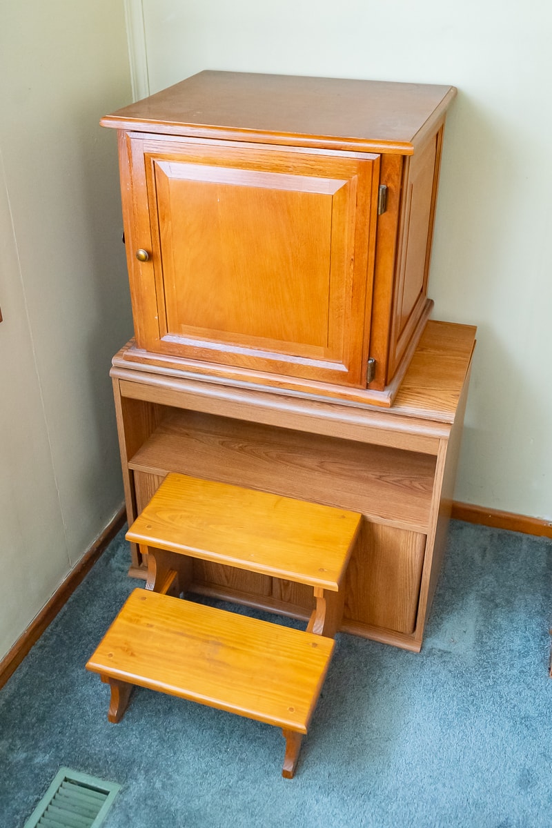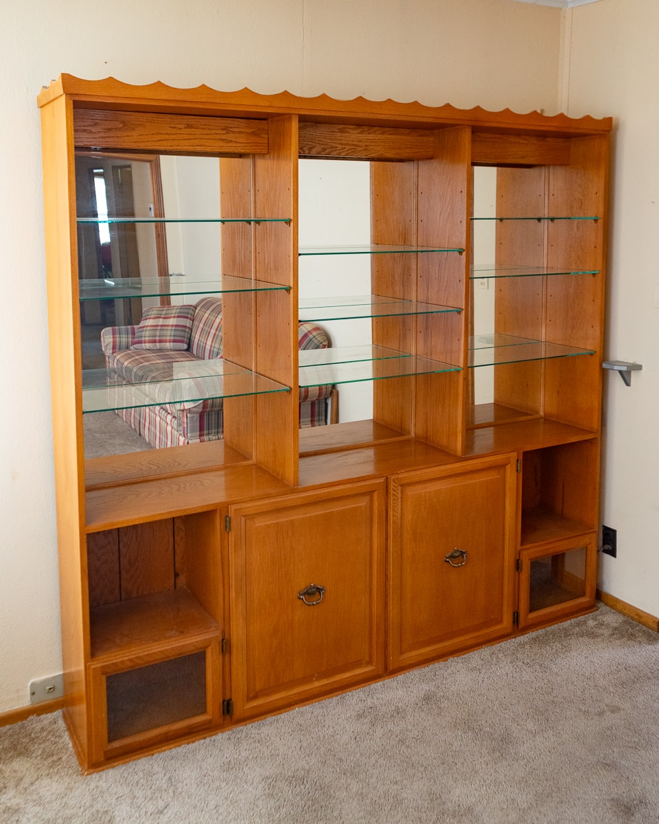Upholstered Wingback Chair, Large Mirrored Bookcase, Plaid Upholstered Sofa, Full-Size Oak Bed, Two Hexagonal End Tables, Oak Craft & Computer Table, File Cabinet, Organizer and Bookshelf, Glider Bench and Three End Tables, American Motif Wood & Metal School Desk, Pair of Dining Chairs, Reproduction Maple Dining Table – Damaged, Lift Top Storage Chest