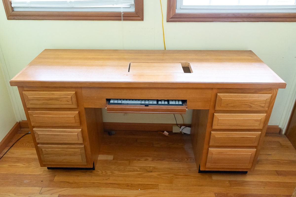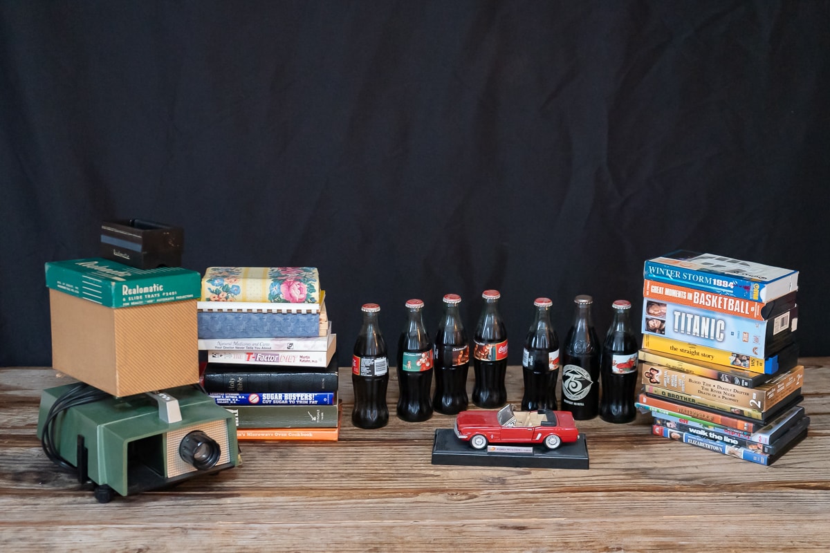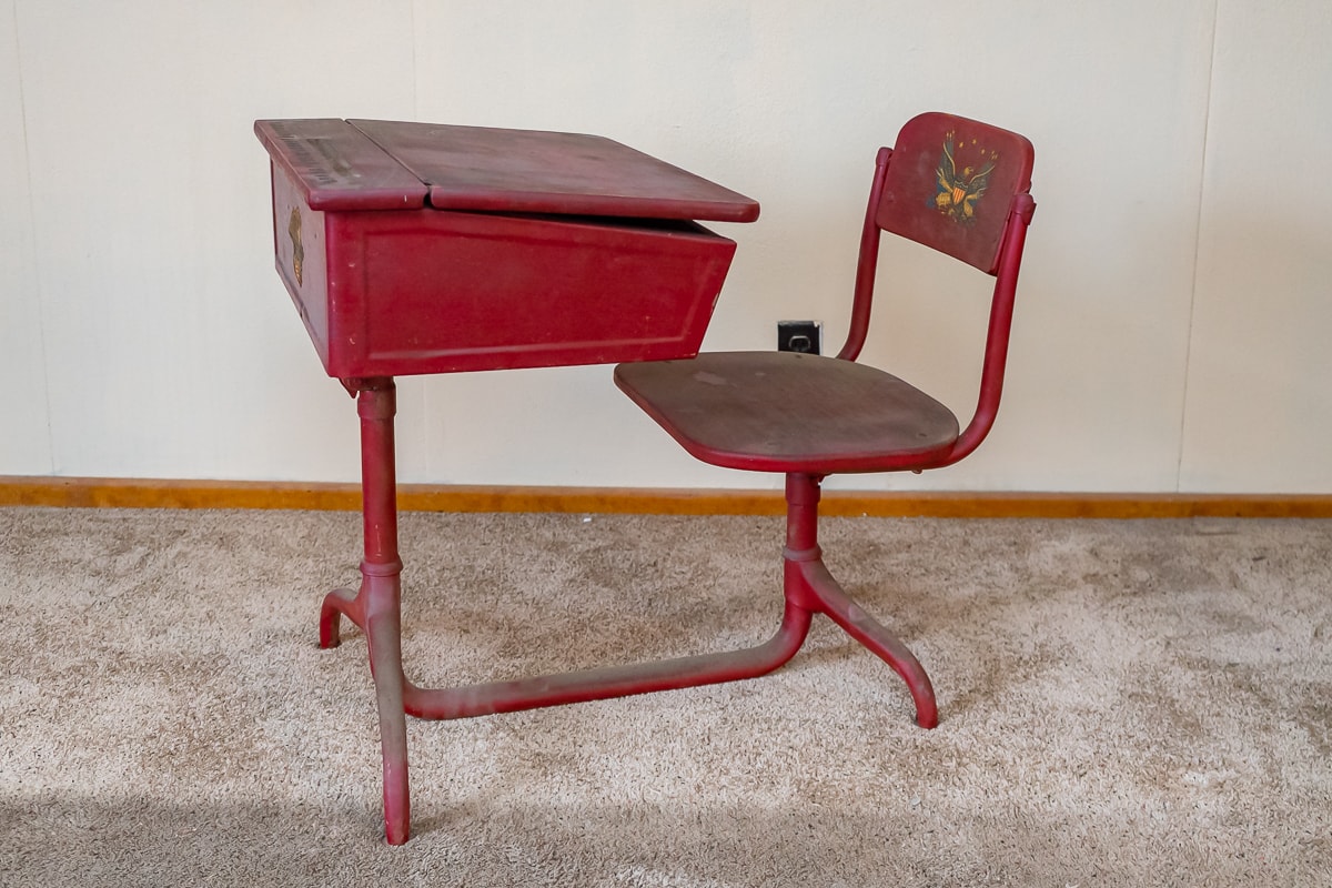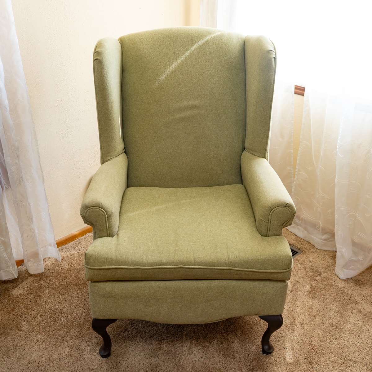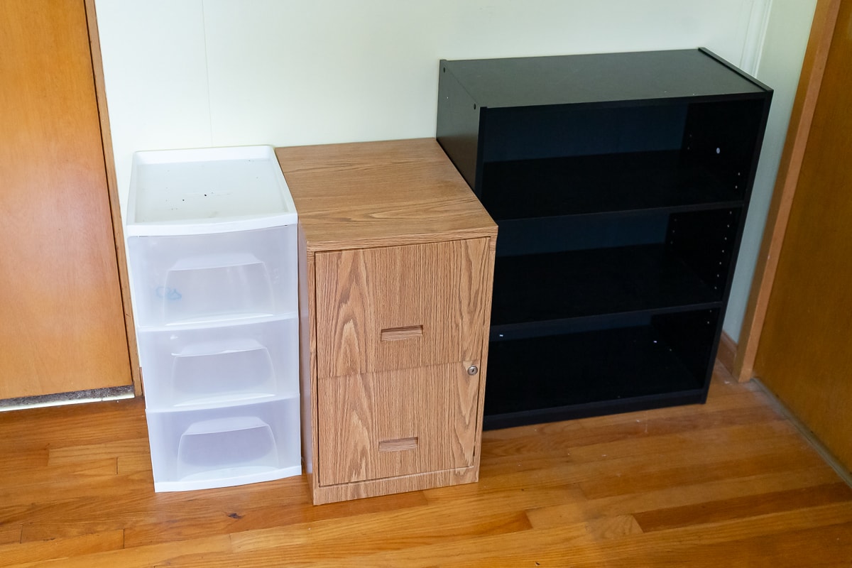 Upholstered Wingback Chair, Large Mirrored Bookcase, Plaid Upholstered Sofa, Full-Size Oak Bed, Two Hexagonal End Tables, Oak Craft & Computer Table, File Cabinet, Organizer and Bookshelf, Glider Bench and Three End Tables, American Motif Wood & Metal School Desk, Pair of Dining Chairs, Reproduction Maple Dining Table – Damaged, Lift Top Storage Chest