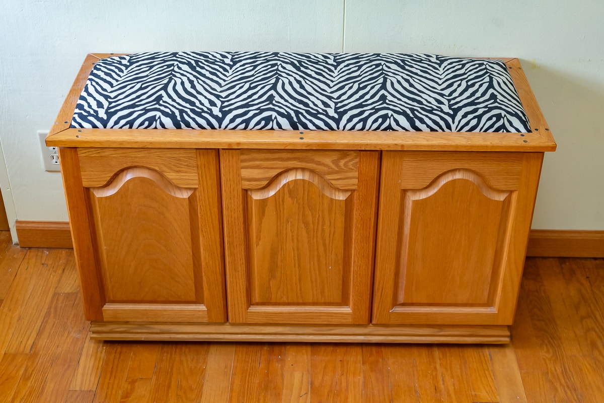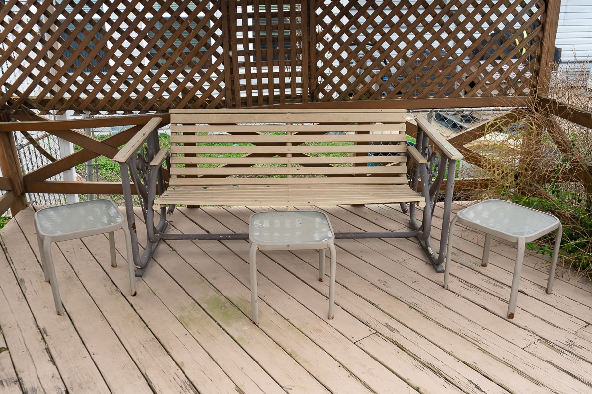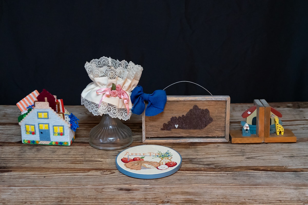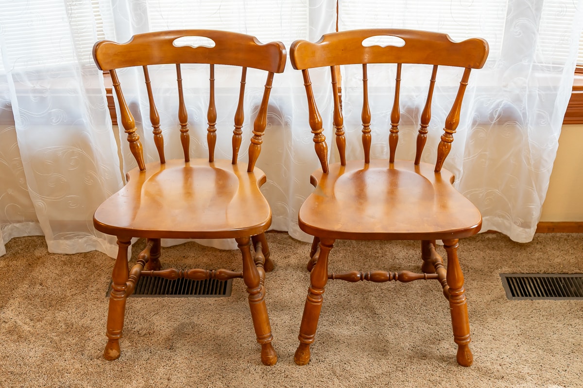 Upholstered Wingback Chair, Large Mirrored Bookcase, Plaid Upholstered Sofa, Full-Size Oak Bed, Two Hexagonal End Tables, Oak Craft & Computer Table, File Cabinet, Organizer and Bookshelf, Glider Bench and Three End Tables, American Motif Wood & Metal School Desk, Pair of Dining Chairs, Reproduction Maple Dining Table – Damaged, Lift Top Storage Chest