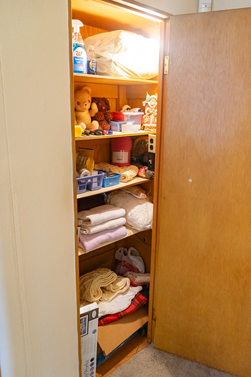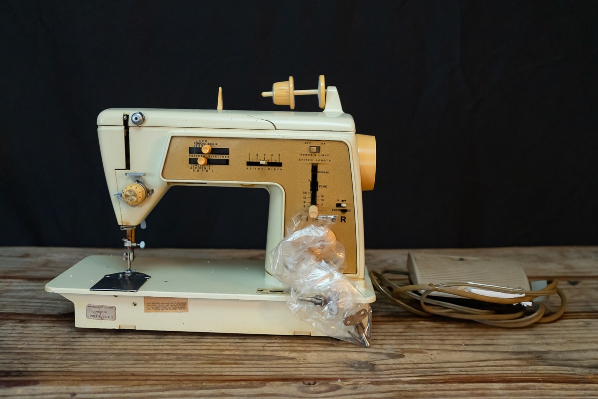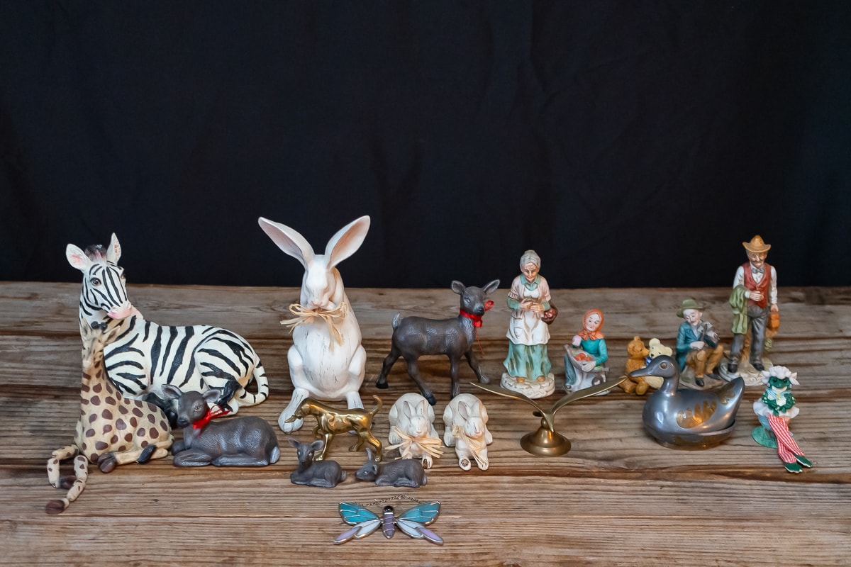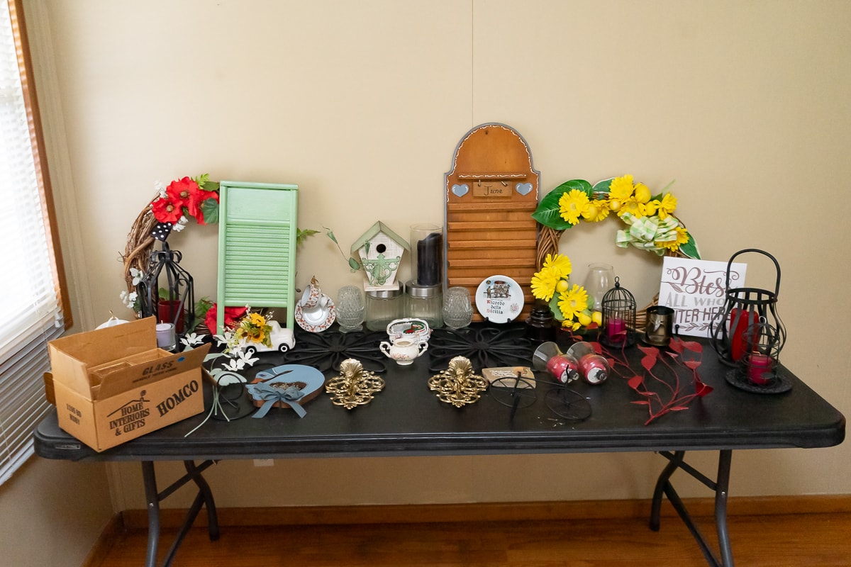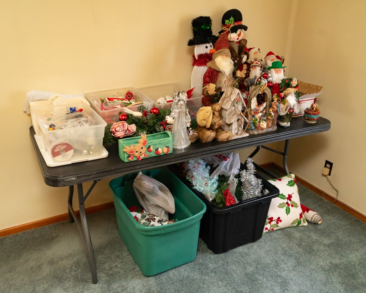 Collection of Christmas Decor, Two Table Lamps, Collection of Figurines, Retro Screech Owl Richard Hinger Print, Craft & Knitting Supplies, Singer Deluxe Model 640 Sewing Machine, Household & Cleaning Supplies, Collection of Framed Prints, Tayse Modern 5′ x 7′ Area Rug, Twisted Metal Table Lamp, Emerson Microwave, Collection of Kitchenware, Large Collection of Decorative Items, Closet of Household Goods and Decor, End Table, Microwave Stand and Wooden Step Stool.