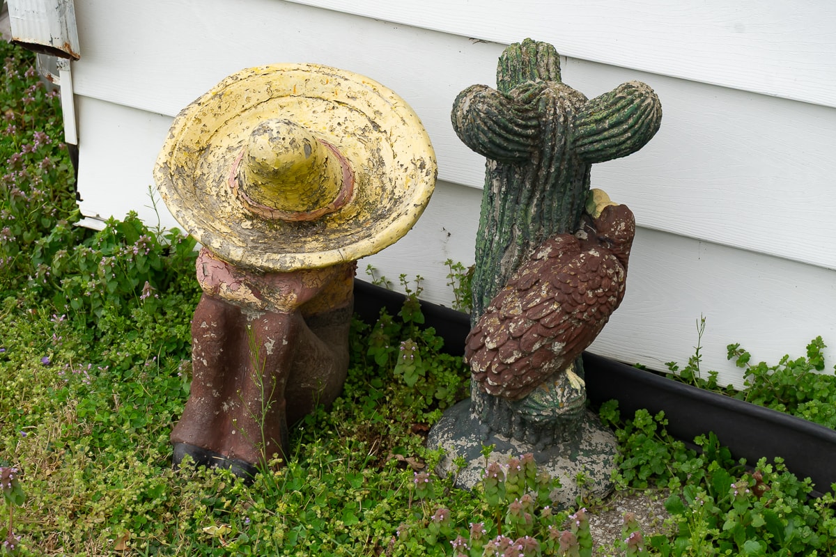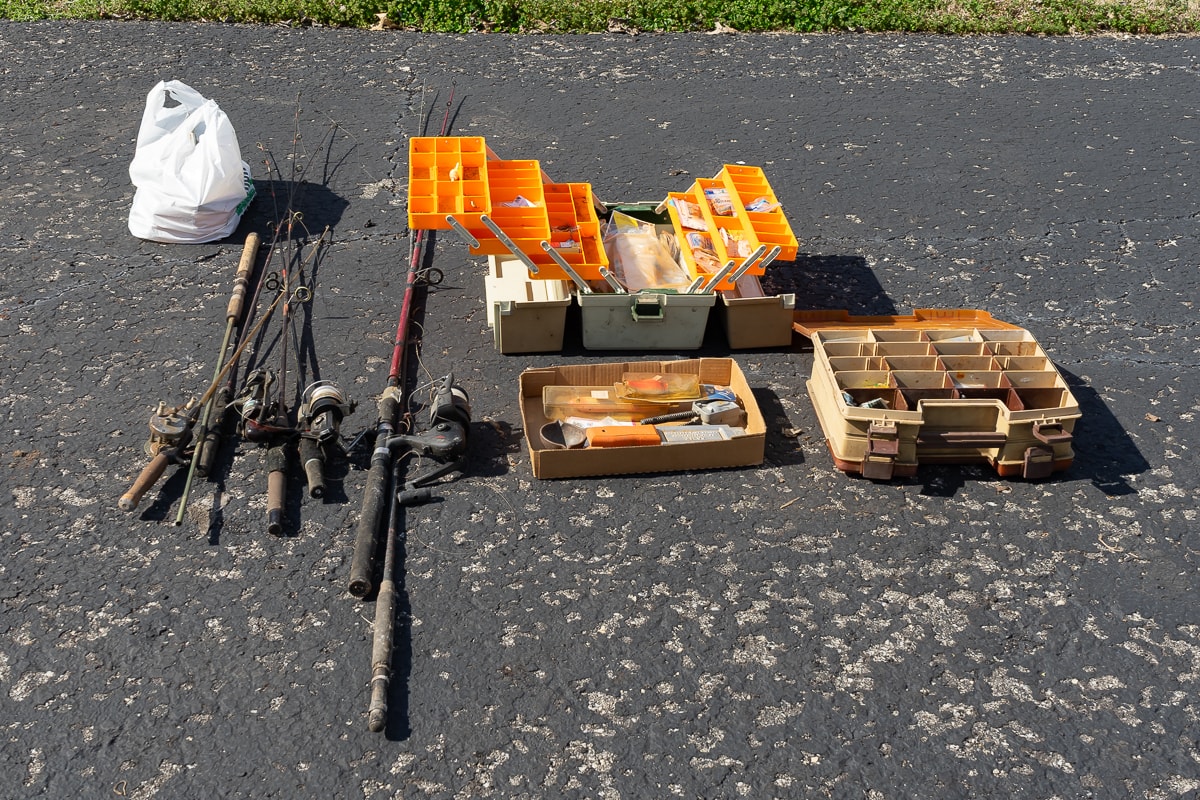 Fishing Poles and Tackle, Collection of Fishing Lures, Large Geode Rock, Classic Lawn Darts, Daisy BB-Gun, York Thunderbolt Bow, John Deere Stake Bed Wagon, Retro Southwestern Style Concrete Garden Art, Yard Art & Decor, Two Hose Reels & more.