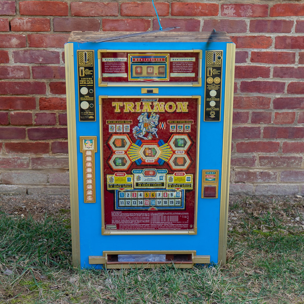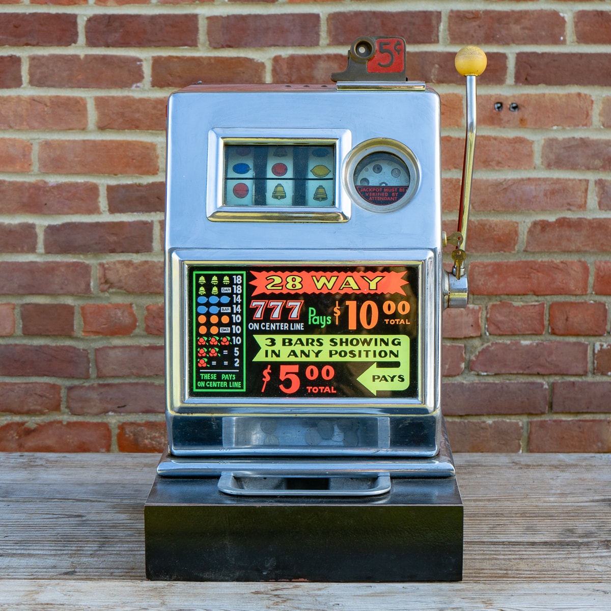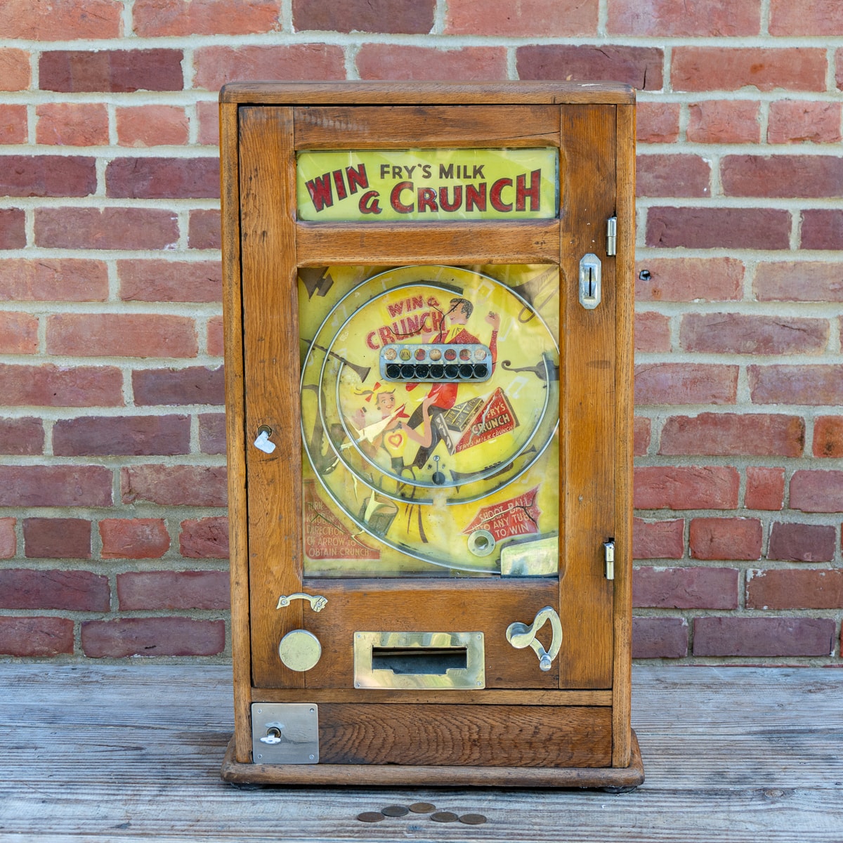 Mills Novelty Co. Red Cherry Five-Cent Mechanical Slot Machine, Five-Cent Slot Mechanical Machine, Early 20th Century Fry’s Milk ‘Win & Crunch’ Wall-Mounted Chocolate Bar Arcade Game, 1970s German Rotomat Trianon Slot Machine, Liberty Five-Cent Mechanical Slot Machine