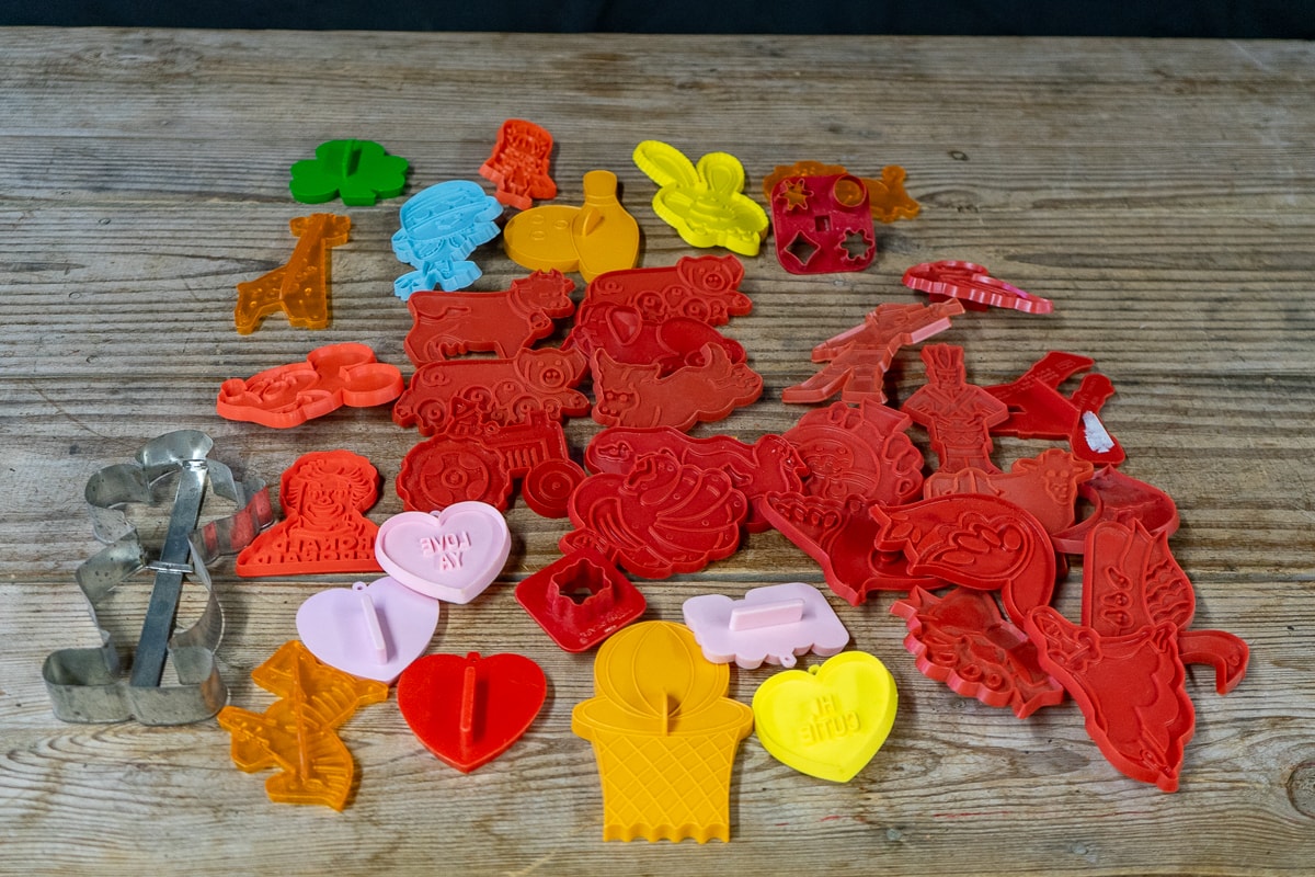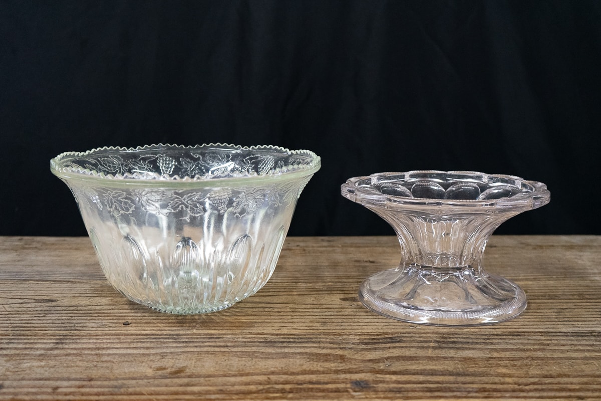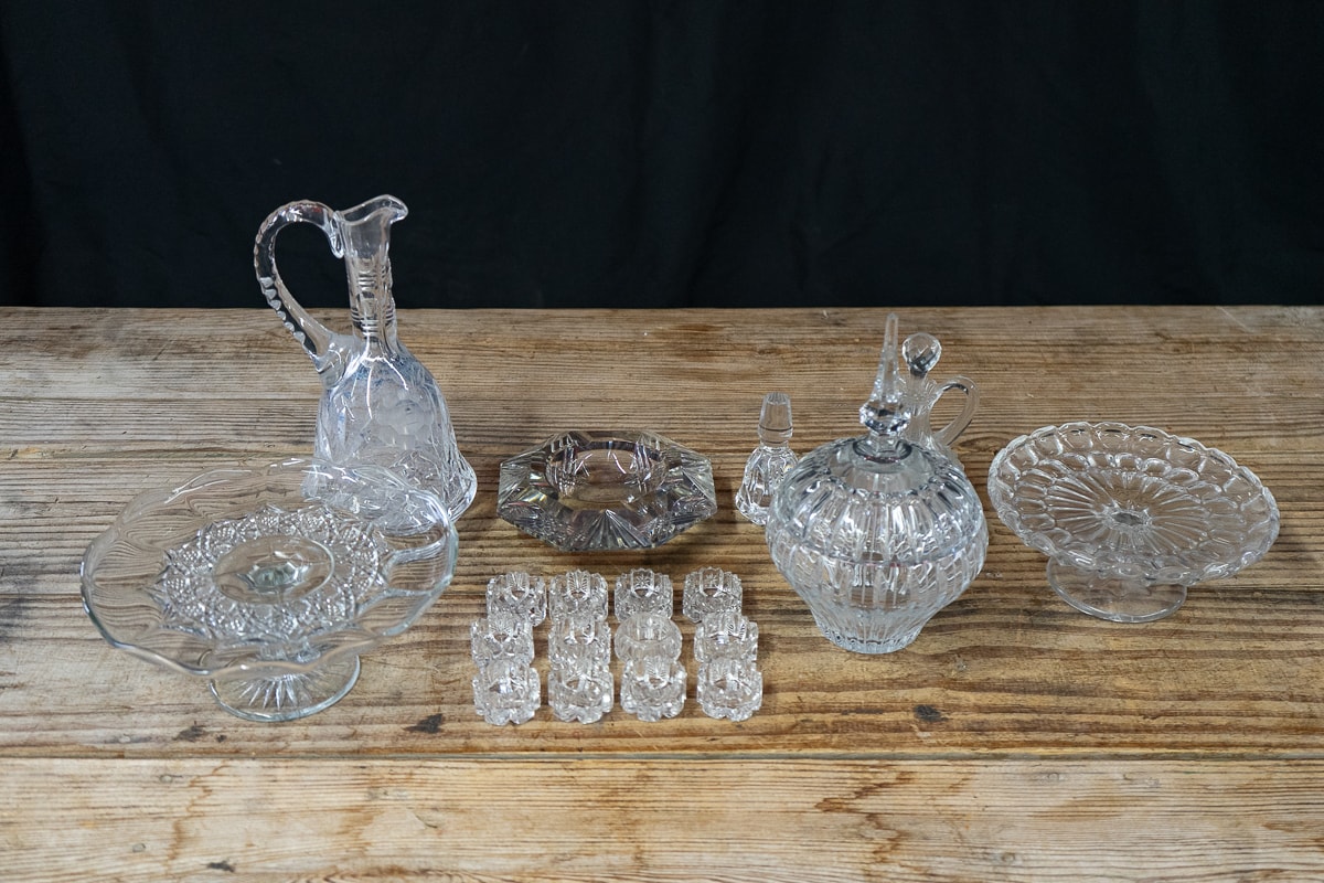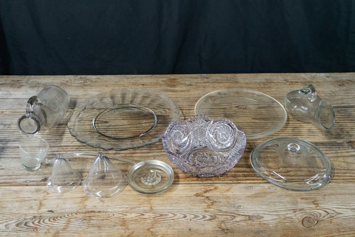 Collection of Pressed Crystal Glassware, Collection of Clear Pressed Glass, GM Body by Fisher Low Ball Glasses, Six Bellheimer Weissbier Pilsner Glasses, Green Depression Glass Sherbets & Water Glasses, Amber Glass, Jadeite, Porcelain Wares & More, Pressed Glass Compote & Fruit Bowl, Pfaltzgraff Yorktowne Blue & White Dinnerware, Theodore Haviland Dinnerware & J & G Meakin Ironstone Tea Set, Tin Cookie Cutters, Assorted Cookie Cutters, Red Plastic Cookie Cutters, Twelve Days of Christmas Cookie Cutter Set, Miniature Homemade Ice Cream Churn, Collection of Assorted Cookie Cutters, Husqvarna Viking HuskyLock 936 Swing Sewing Machine